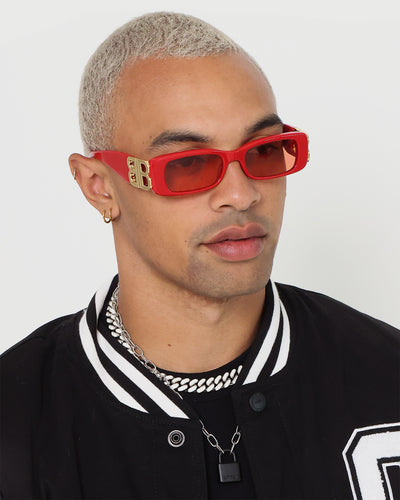 Balenciaga has landed at Culture Kings and we couldn't be more ready for it! A slim rectangular frame in a bold red adds an eye-catching touch to these sunglasses from Balenciaga Eyewear. The bold detailing continues with straight arms, tinted lenses, and a gold-toned Balenciaga butterfly logo on the arm.