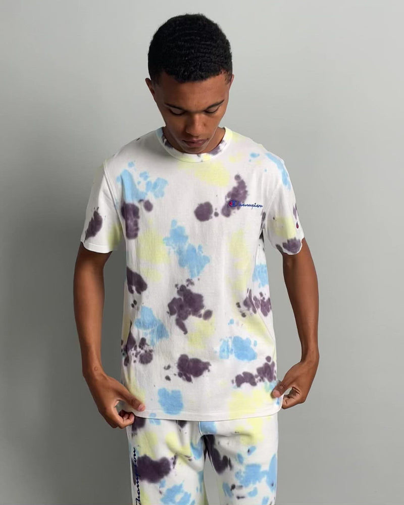 Step out on cloud nine in the Champion Cloud Dye Cut-Off Shorts. This cotton t-shirt keep things mellow with a soft dye pattern, ribbed crewneck and embroidered Champion branding on the chest.