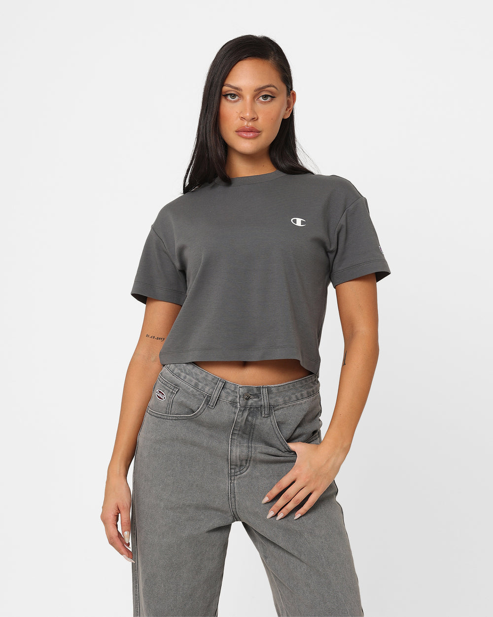 Dropped shoulders and cropped fit create a relaxed silhouette.