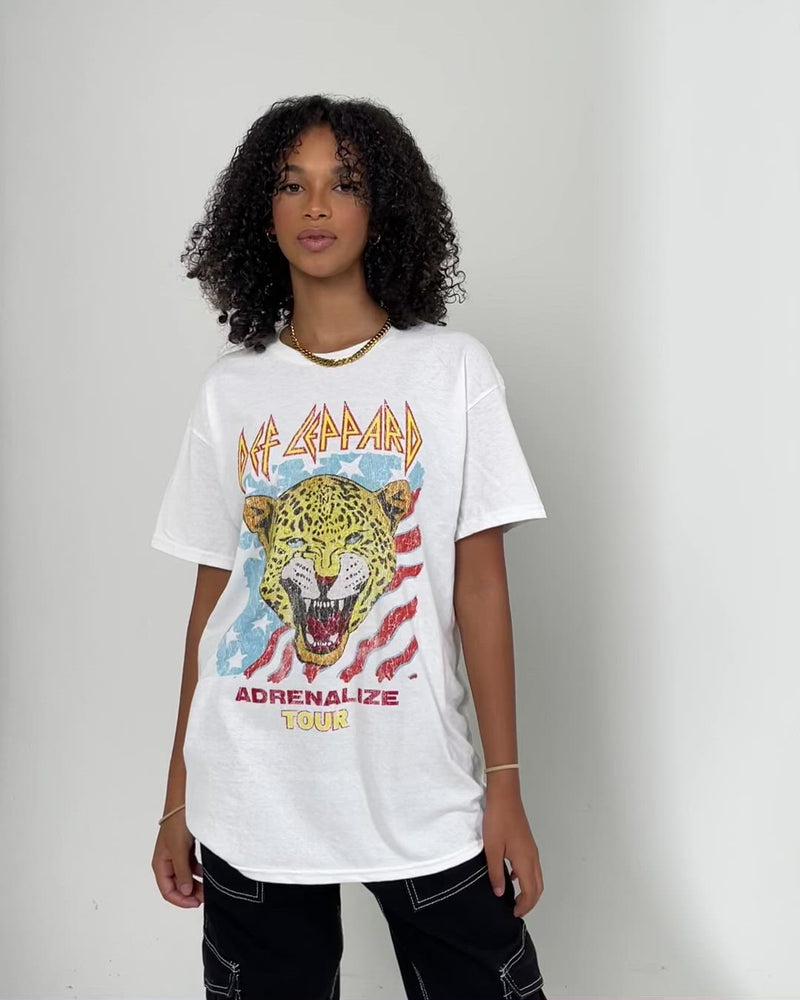 The Adrenalize Tour T-Shirt features graphics inspired by the English rock band, Def Leppard's 1992 studio album, Adrenalize, and its following tour. Made with pure cotton, ribbed neck, and twin needle stitching.