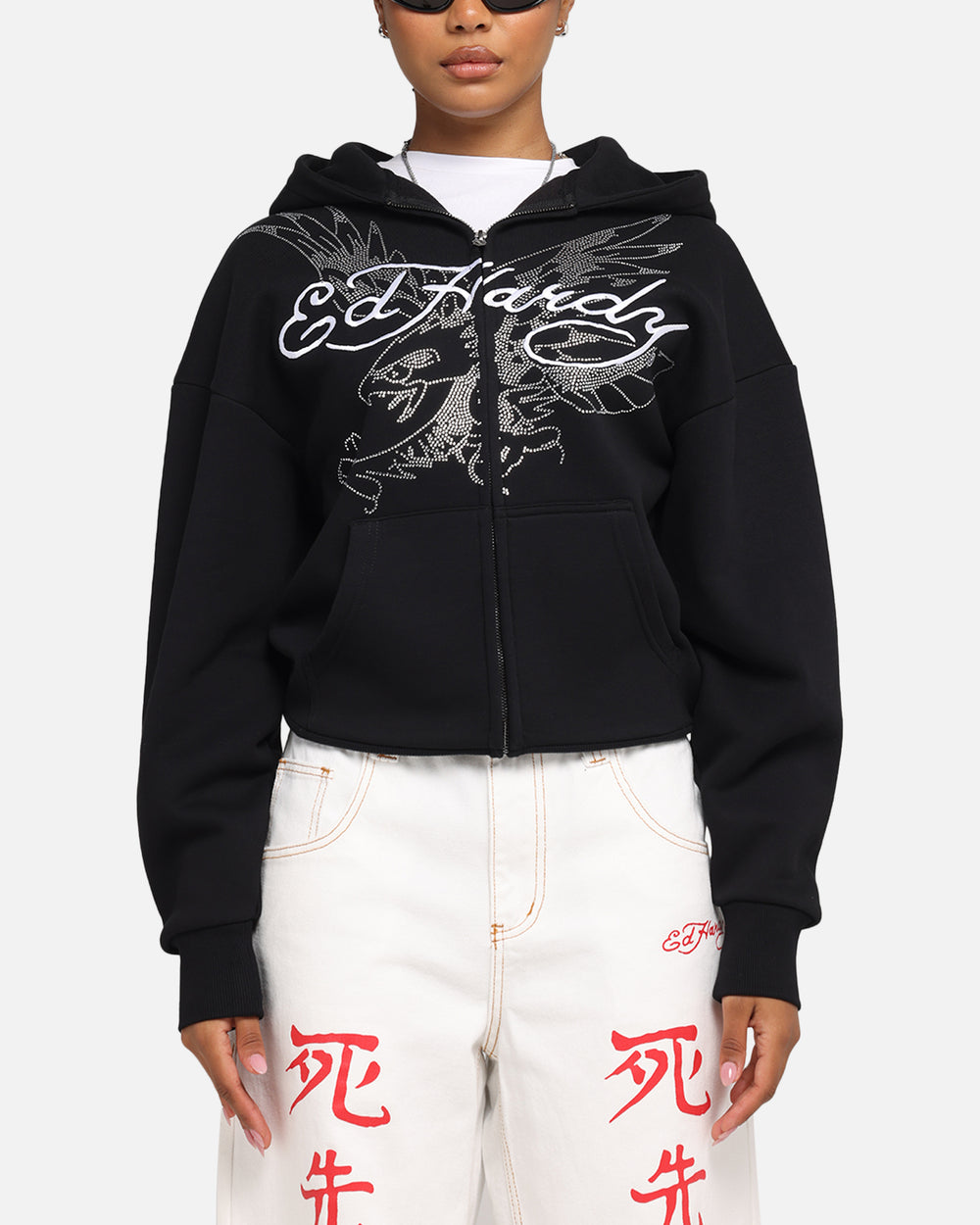 Embrace your unique vibe with the Ed Hardy Eagle Rhinestone Zip Hoodie—where edgy design meets everyday comfort. This striking hoodie features bold embroidered graphics and rhinestone details inspired by Ed Hardy’s iconic tattoo art. Crafted from a cozy brushed fleece interior that is perfect for that extra warmth. The oversized boxy fit and ribbed trims ensure you stay comfortable while making a statement, no matter the occasion. Cop yours today at Culture Kings.