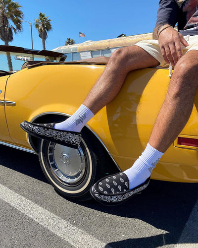 Make a statement in Goat Crew's new range of hip hop and pop culture influenced apparel and accessories, guaranteed to keep everyone on their toes. These indoor/outdoor moccasin-style slip-on 'Bandana Slippers' showcase the freshest custom printed Paisley design and are our newest MUST-COP of the season! Worn by world-class athletes, celebrities and hip hop artists, our bandana shoes are so comfortable you'll want to wear them everyday. Not for the faint of heart, the Goat Crew Bandana slippers are the perfect go-to statement shoe, elevating your casual off-duty look with effortless style.