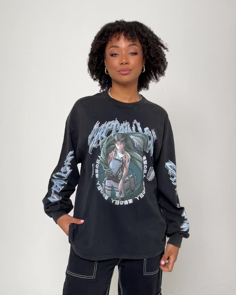 Ruthless and resilient, Levi Ackerman won't stop until he puts an end to the nightmare of the Titans. You'll have to be just as tenacious as the squad leader if you want to cop one of the pieces from this Goat Crew X Attack On Titan collab. The Captain Levi Long Sleeve T-Shirt is just one of the iconic items you can get your hands on with a vintage wash, cracked custom graphics, and quality construction.