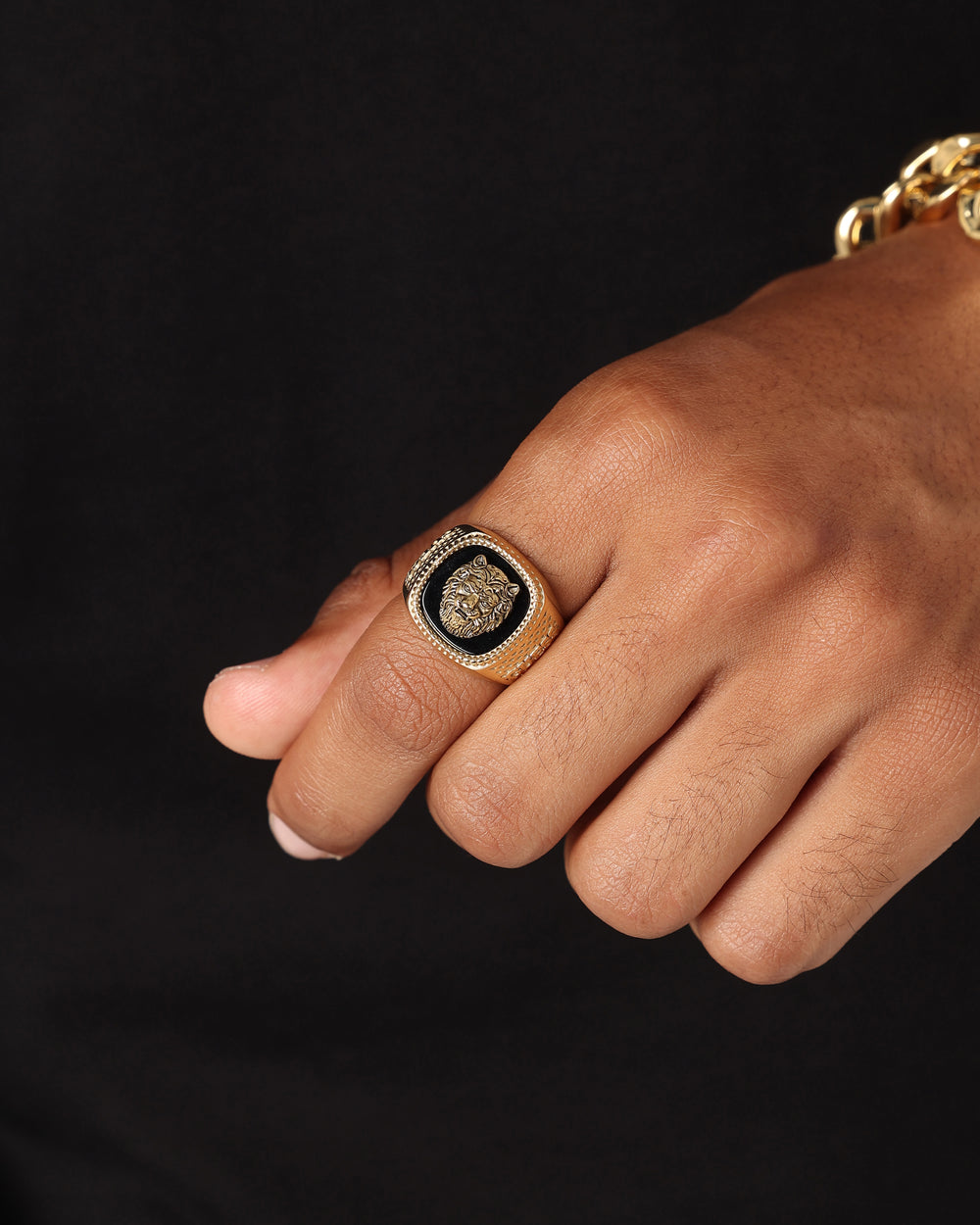 - Statement lion head engraving detail