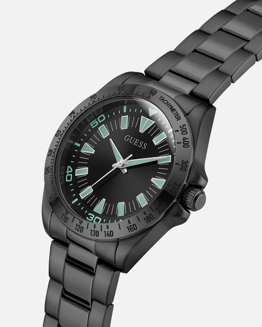 Top your look with this classic timepiece from Guess. The black stainless steel bracelet and dial are the perfect way to take your fit to the next level and add a touch of luxury to your look. Practical as well this watch features water and shock resistance so you know it's ready to take on whatever the day throws at you.