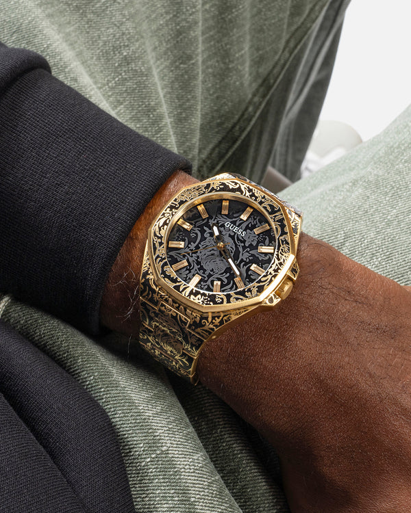 A statement timepiece crafted for greatness. This Gold Tone 46mm watch is complemented with an edgy black digital print throughout that'll have you standing out from the rest. Be sure to cop yours today at Culture Kings.