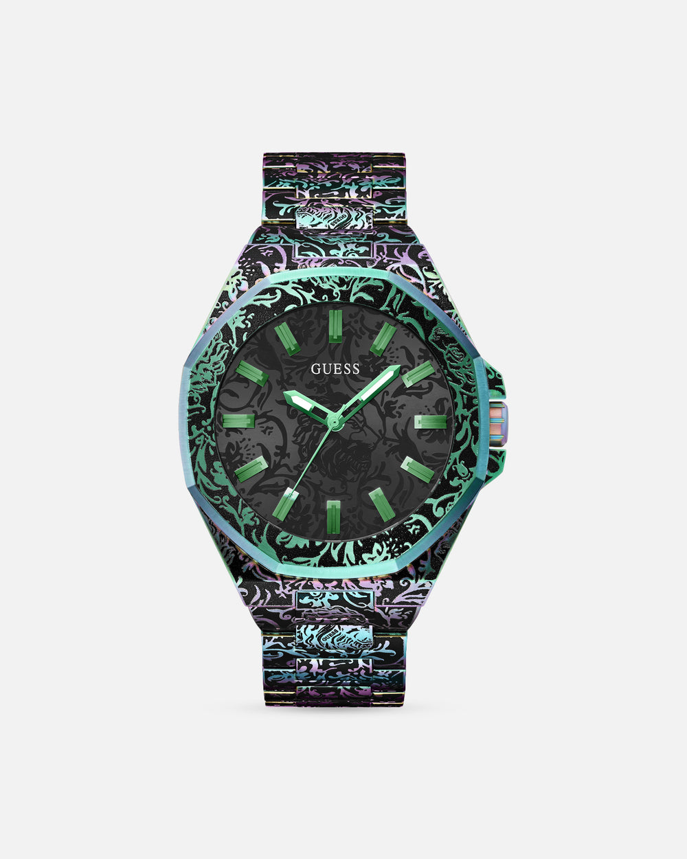 A statement timepiece crafted for greatness. This Iridescent 46mm watch is complemented with an edgy black digital print throughout that makes it a real crowd-pleaser. Get your hands on it today before stock runs out at Culture Kings.