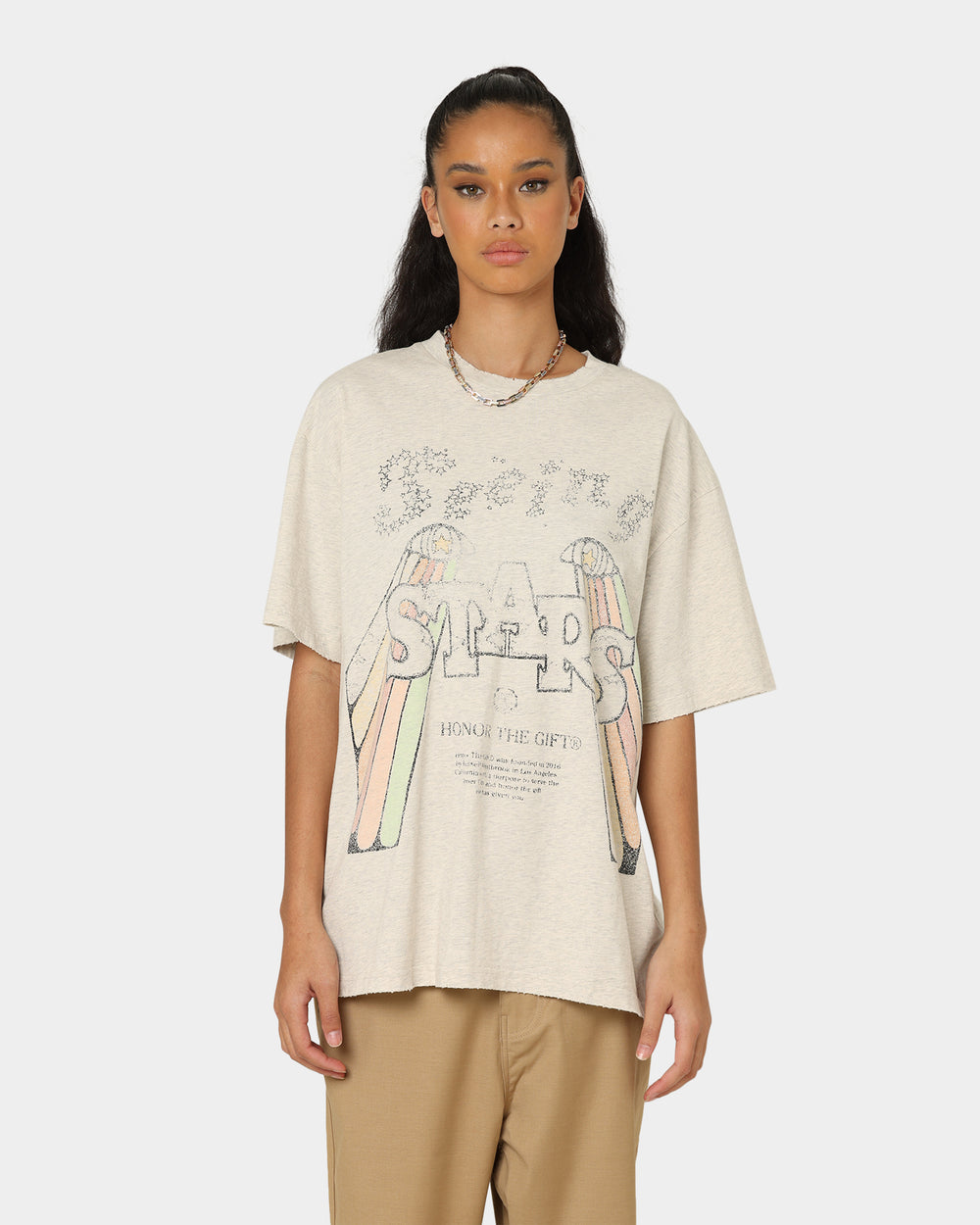 After tearing up the court Russell Westbrook has made a play in the fashion world with, Honor The Gift. The Seeing Stars T-Shirt encompasses the theme of the brand with heavyweight cotton that feels premium and sturdy. Topped with a faded screen print on the front, a vintage-aged wash, and knick and grind distressing along the hems, collar, and cuffs to give it that old-school look and feel.