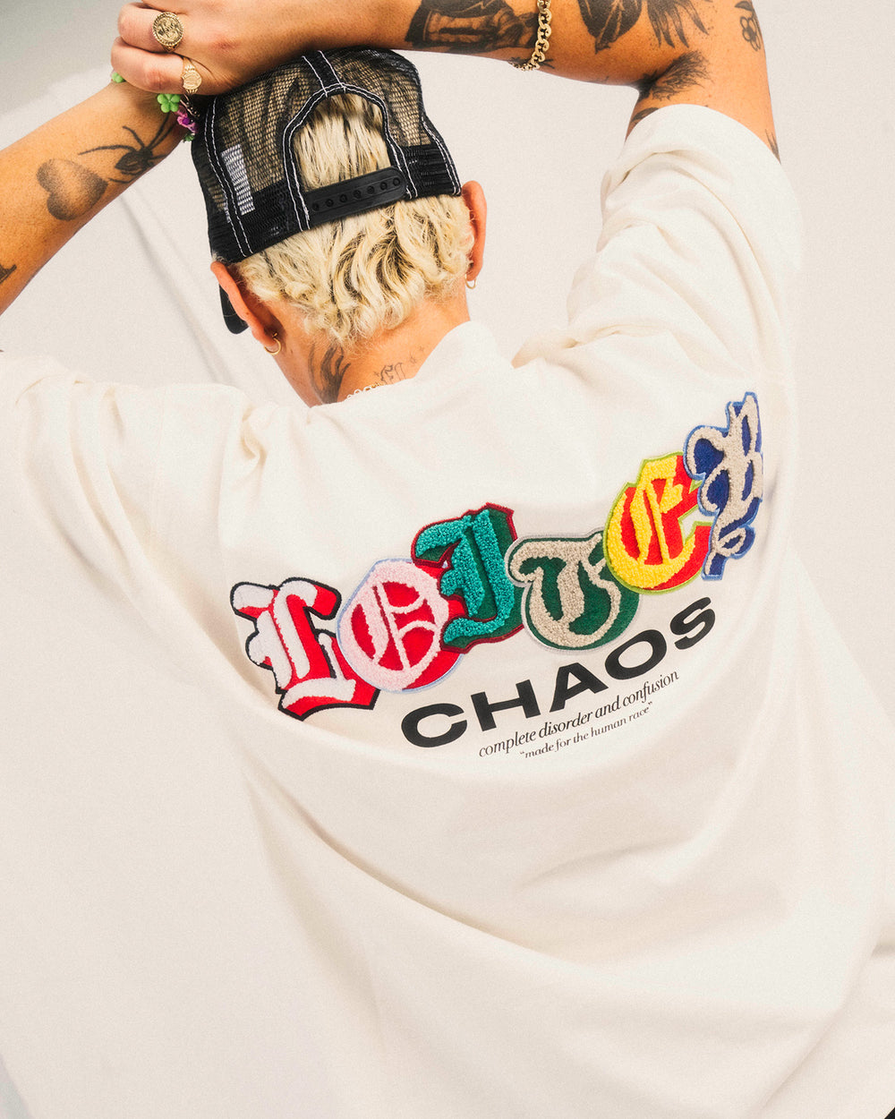Take on complete disorder and confusion with the Chaos T-Shirt. A premium mix of chenille embroidery and printed Loiter graphics add texture. Made from midweight 220GSM cotton french terry.