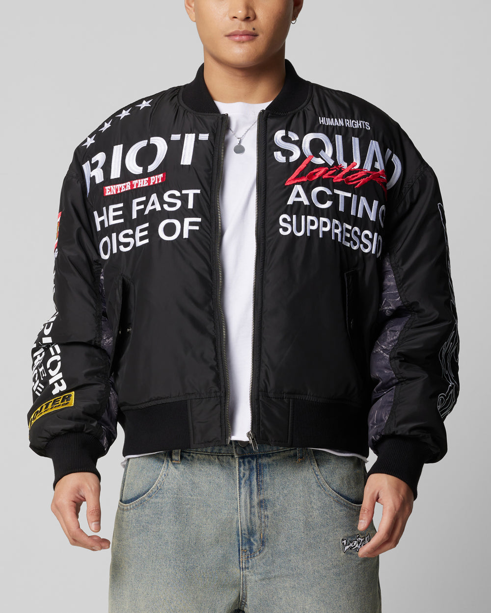 Loiter has got your looks covered with the Riot Squad Bomber Jacket by Loiter. Featuring a mix of epic embroidered and printed graphics with ribbed trims to keep you warmer for longer and dropped shoulders for a laidback look. Be sure to secure yours today at Culture Kings.