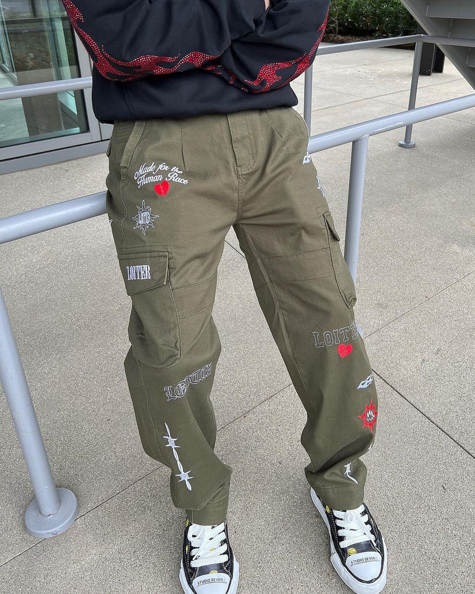 Loiter breaks the rules with the Sketch Cargo Pants. Adding a flare to the usually practical pants with the all-over embroidered logos. Topped off with a heavyweight cotton webbing strap detailing the cargo pockets, a straight leg design, and stretch cotton twill.