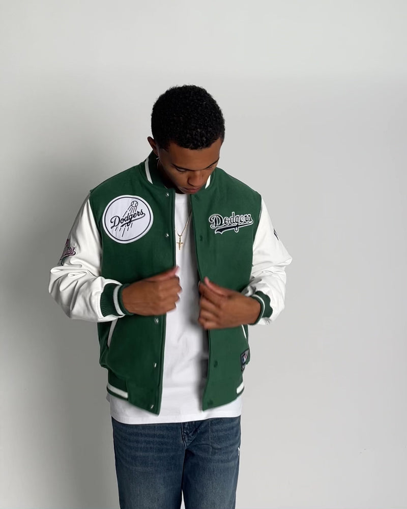 Rep the pros this game day with the Los Angeles Dodgers Team Wordmark Melton/PU Leather Jacket from Majestic Athletic. Featuring embroidered graphics on a go-to varsity jacket silhouette, this is finished off with leather sleeves and classic snap button details to lock in the warmth. Cop it today at Culture Kings.