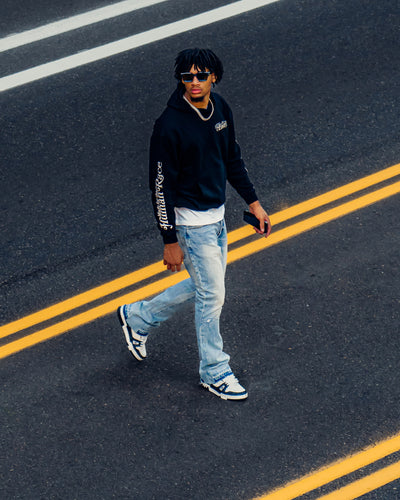 Trust MNML with all your denim needs to ensure you're getting the best of the best. The B221 Flare Denim Jeans are a fresh take on the flared look with contrasting denim panels on the inseam and outseam. Distressed details and raw cut hems pair perfectly with the washed denim to create a vintage look and feel.