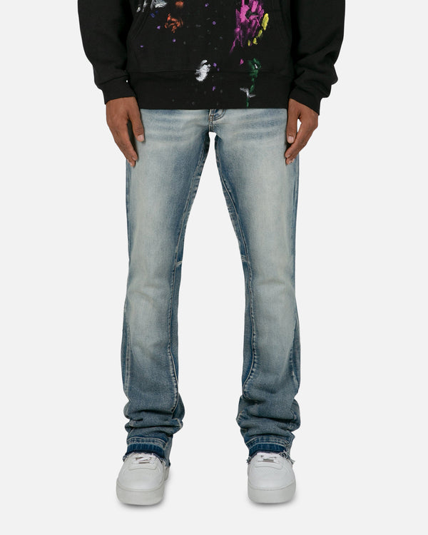 Elevate your fits' with the B484 Flare Jeans by MNML. These are designed with a new B fit, which is slim through the thigh and features a slight flare at the leg opening and is constructed from medium washed blue denim, panelling at the inseam and outseam from denim for a slight flare, distressing details at the back of the leg openings, and finished with a deconstructed hem. Cop yours today at Culture Kings.