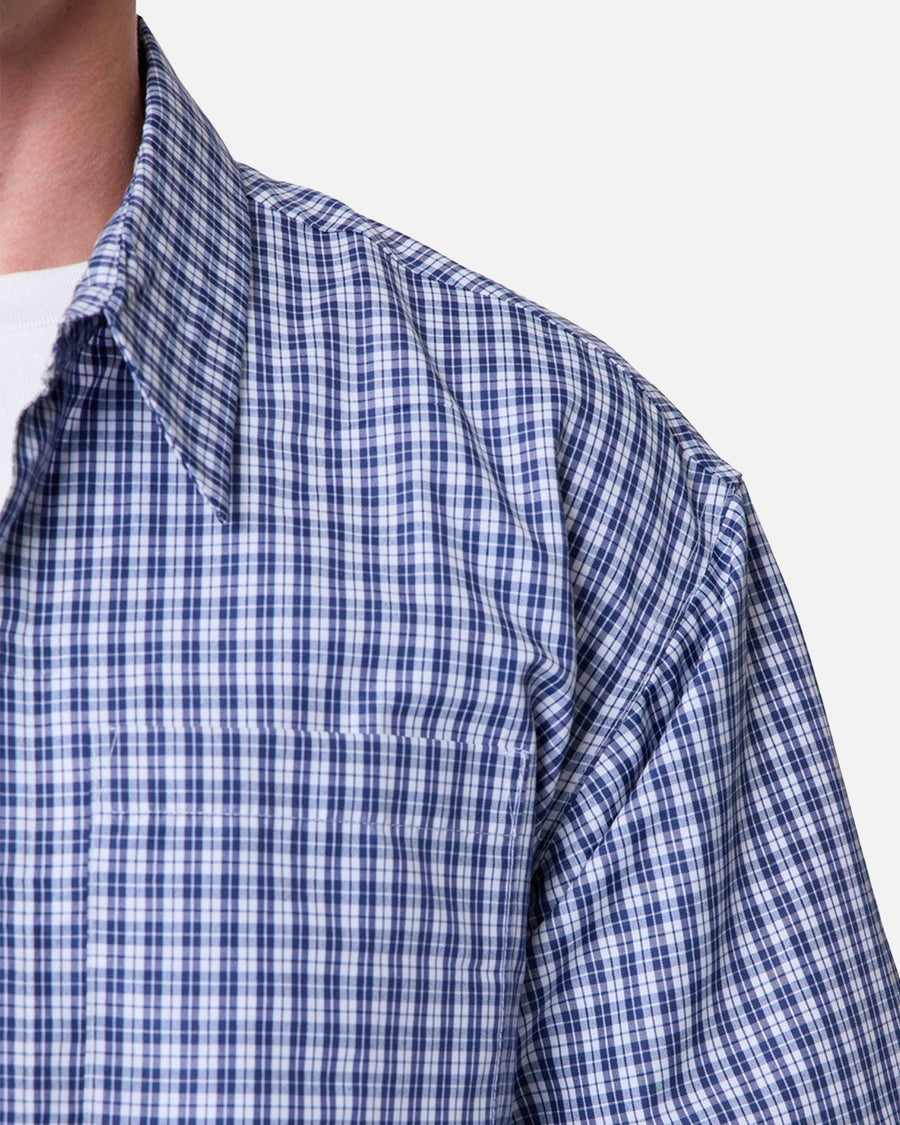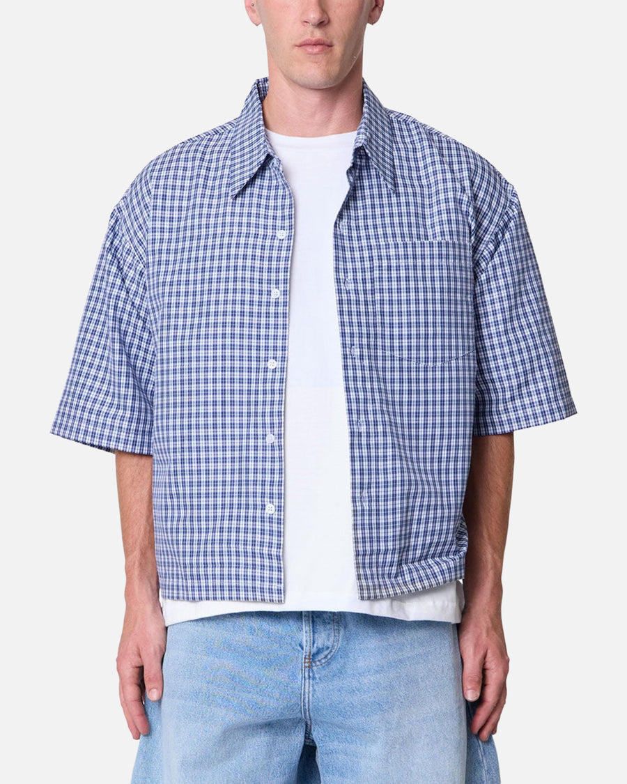 Elevate your fits' with this Crispy Poplin Over Button Up Shirt by MNML. This is constructed from premium cotton blend with a cropped length and a boxy silhouette. Designed with dropped shoulders that includes a classic spread collar and single chest patch pocket. The acid-wash plaid print pattern for a classic look. Cop yours today at Culture Kings.
