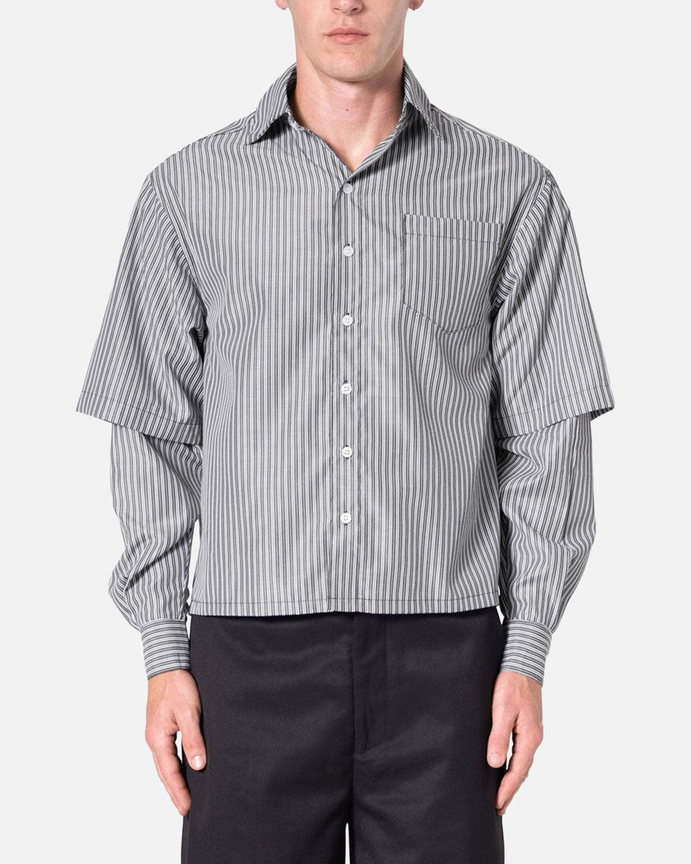 Elevate your fits' with the Double Layer Pinstripe Shirt by MNML. This shirt is made from all-over pinstripes with a lightweight fabric blend. This relaxed fit and dropped shoulders allow for a streetwear vibe, while the double sleeves provide you with a layered look. Cop yours today at Culture Kings.