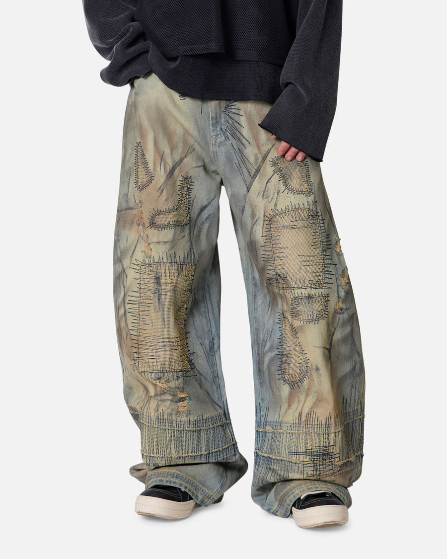 Stand out from the rest with the Stitched Barrel Denim Pants by MNML. These pants are constructed from a premiium cotton with an oversized, wide-leg barrel fit with a straight drop from hip to hem. This design incorporates scattered abrasions and fraying for a heavily aged, lived-in appearance, complemented by all-over patchwork and boro-like stitch work. Cop yours today at Culture Kings.