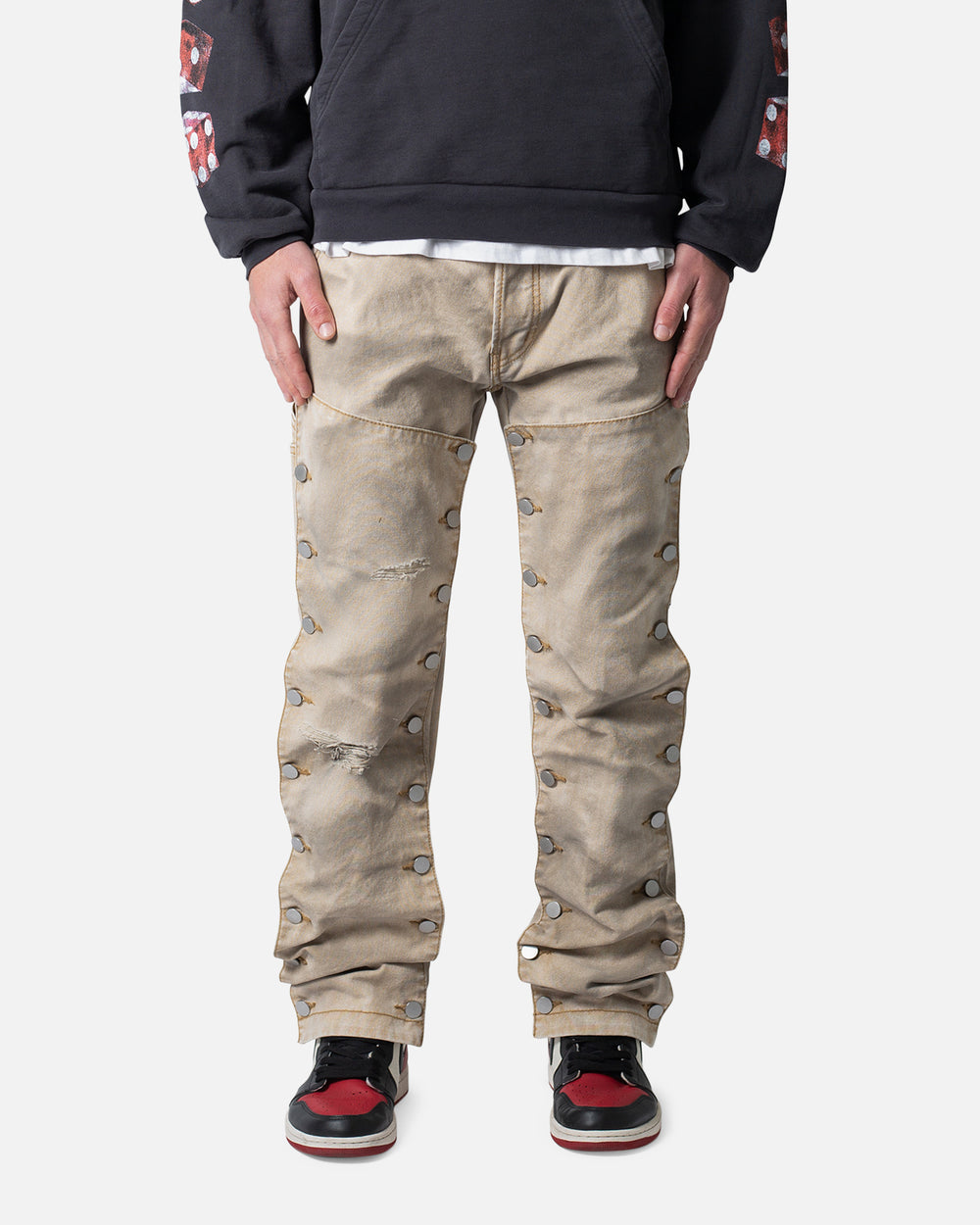Make a statement in the V624 Snap Off Baggy Pants by MNML. These pants are crafted from high-quality washed denim material that boasts a unique textured look and feel. The distressed details throughout the pants add a touch of ruggedness and character that perfectly complements the overall design. They're made complete with the button details through the leg for a standout look that can't be beat. Get your hands on these versatile and stylish pants today, only at Culture Kings.