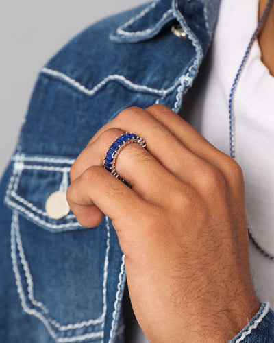 The Baguette Ring is a must have feature piece to add to your collection. This ring offers luxurious, baguette-cut stones that wrap full around the band on an 18k white gold plated stainless steel base so you know it'll last. Cop it today at Culture Kings.