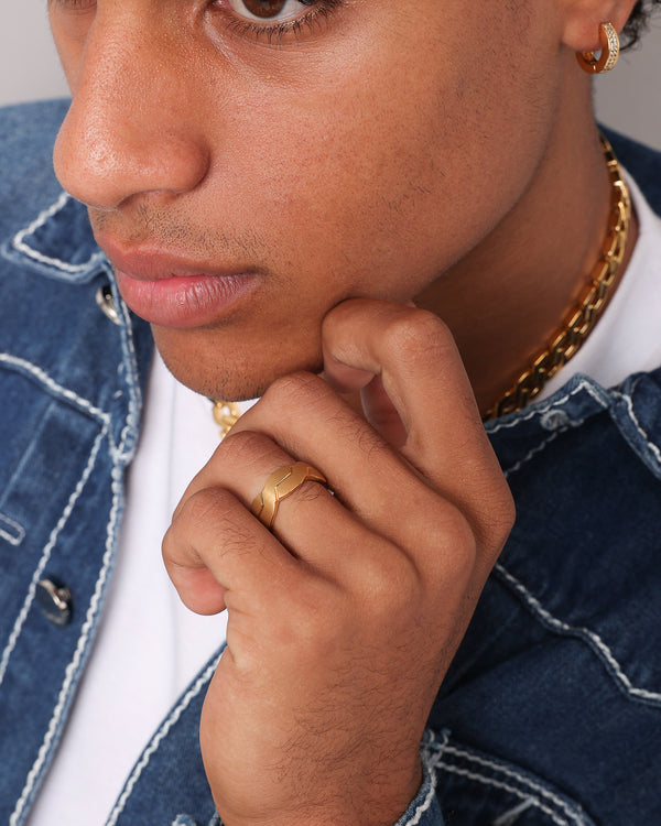 This ring serves a sleek yet intricate design that will pull together any outfit. Featuring a twisted pattern that wraps full around the band, displaying the eye-catching 18k gold plated bases that are sure to last, this piece is a must cop. Grab it at Culture Kings today.