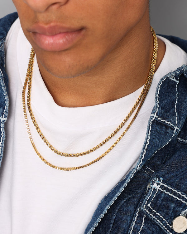 Get two looks in one with the Wheat And Franco Set. This set features 18k gold plated stainless steel bases so you know it's made to last with lobster clasp closes to finish them off. The two different chain types make it standout from the rest. Cop yours today at Culture Kings.