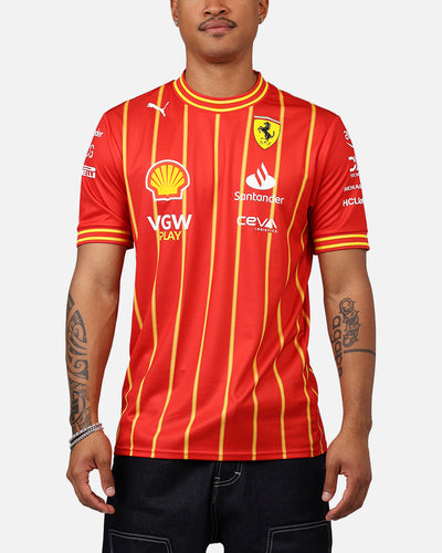 Mixing the world of Formula 1 and Soccer, this jersey is inspired by the Scuderia Ferrari and is designed to be worn on and off the track. This is the new 2024-2025 soccer Jersey collection featuring the colors of the Scuderia Ferrari Team uniform and personalisation of Carlos Sainz on the back. The Ferrari red and yellow combo and the sponsors' logos give an extremely modern impact to a garment that flatters the body's movement and shape. Be sure to secure yours today at Culture Kings.