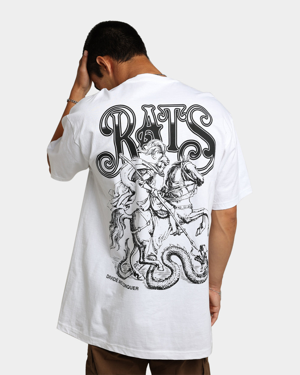 Show your strength with this new tee from Rats Get Fat. The Divide And Conquer T-Shirt is perfect for spicing up your fits with its custom linework prints to the front and back. Made with premium cotton for the ultimate durability and comfort, this tee will take you anywhere.