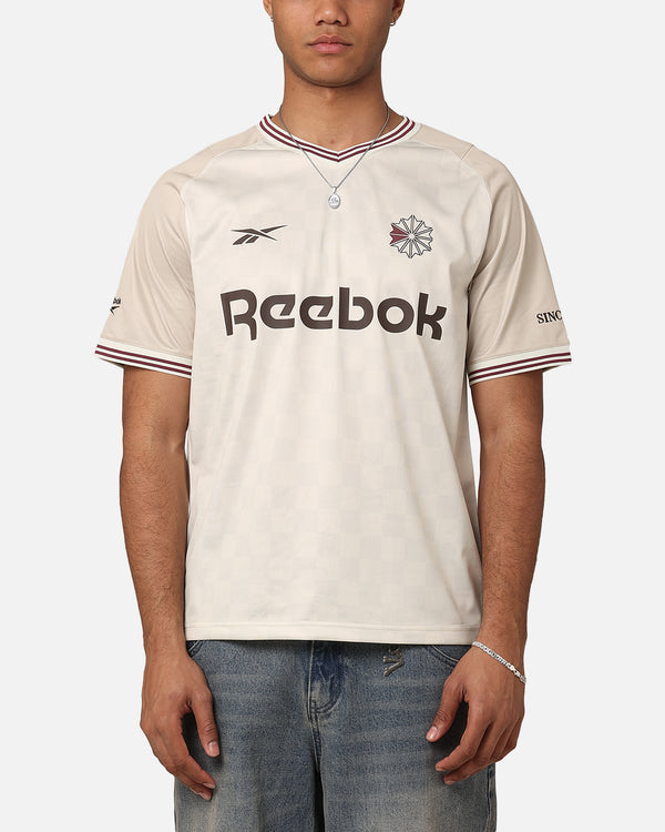 The Beige Heritage Jersey by Reebok is the perfect blend of street and sportswear. This tee features embroidered graphics on the sleeves and printed graphics on the front and back for an iconic vibe. Finished with contrast ribbed trims and twin needle stitching for extra reinforcement. Cop yours today at Culture Kings.