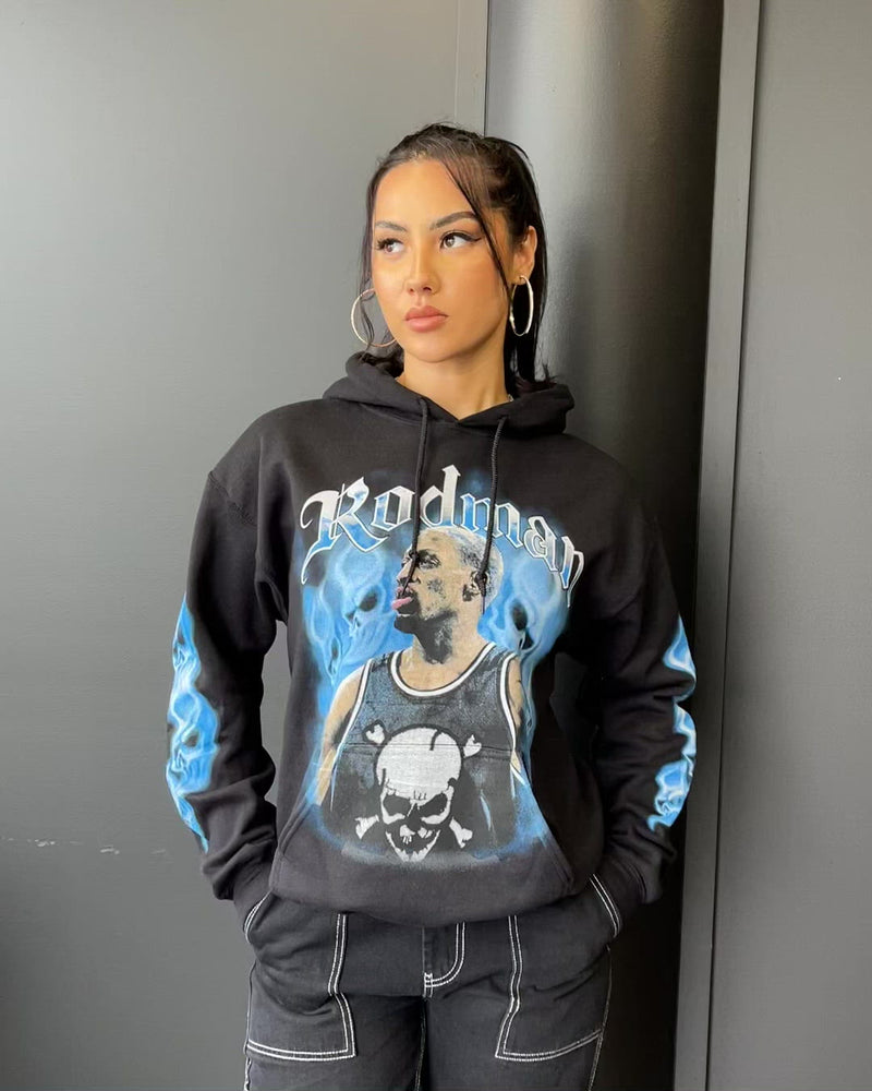 We've worked with Rodman himself so you can't get this anywhere else on the planet! More than just a legendary basketball player, Rodman is also known for his iconic moves off the court. This hoodie celebrates the man that is with quality fleece lining, cracked graphics, and a vintage wash. Cop your own Rodman hoodie and hope that a little of the Rodman spark rubs off on you.