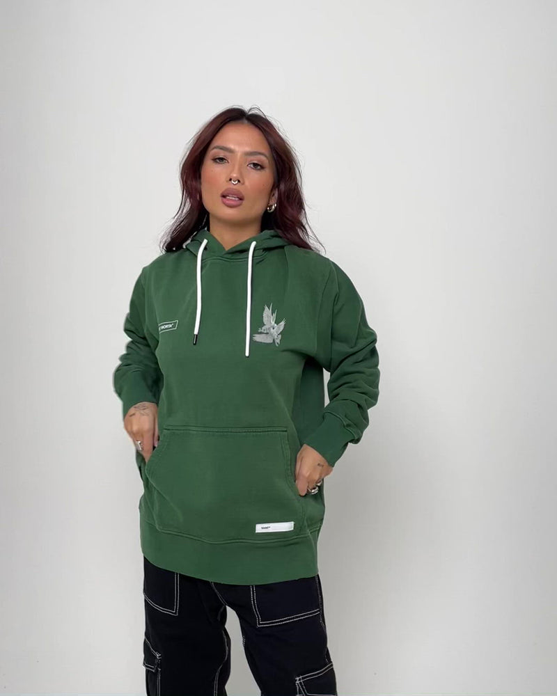 A symbol of peace in the chaos. The Doves Vintage Hoodie is made from heavyweight cotton fabrication and features distressed ribbed trims for comfort. Finished with new graphics to the front and back.