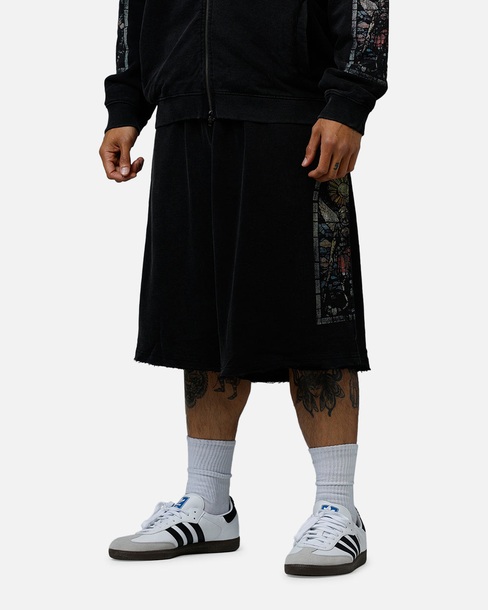 Kick back and relax with the Kingdomcome Baggy Sweat Shorts. These shorts feature printed graphics for a look like no other, raw edge hems to keep it casual, and an elastic waistband that has an adjustable drawstring for ultimate comfort. Cop yours today!
