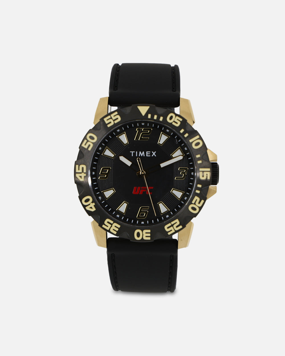 The Timex X UFC Champ Watch is a timepiece you want in your corner. Designed to reflect the power and precision of the UFC’s finest, it’s built with a 42mm gold-tone stainless-steel case and a highly sculpted stainless-steel bezel that demands attention the moment you put it on. The clean dial hosts a bold combination of Arabic and tapered Baton markers, as well as luminous hands for night visibility. But this watch isn't just for show. It's built to last with a silicone strap that provides a comfortable fit no matter how intense the workout, and a uni-directional rotating top ring that ensures precise timekeeping during training.