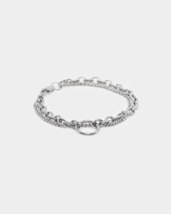 The Strain Bracelet features two interwoven chains that intersect with an oversized jump ring in the bracelet's centre