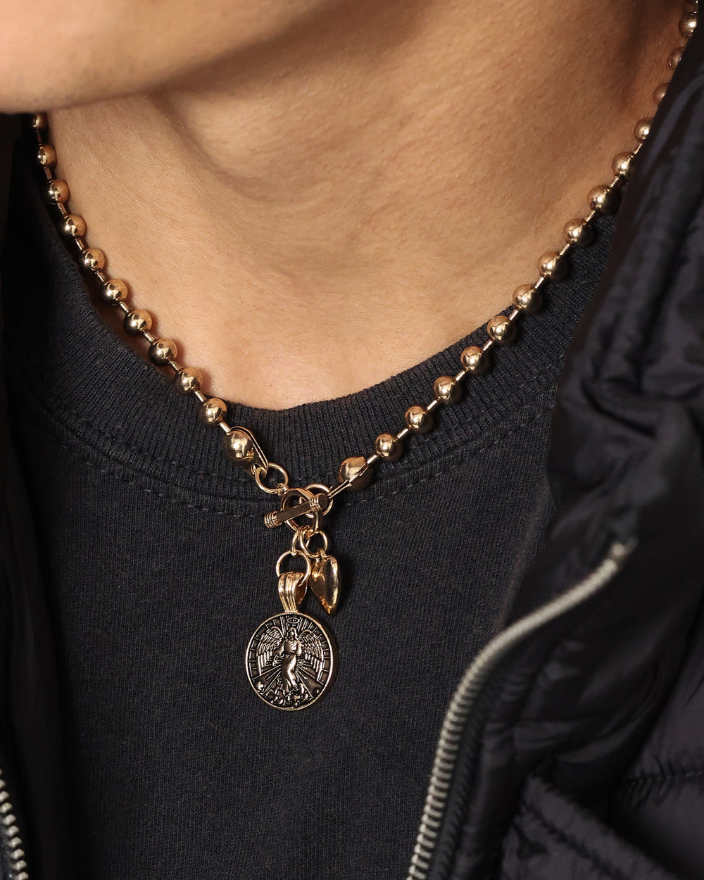 Bring the heat with the Arkangel T-Bar Necklace. Intricately detailed Coin and Heart pendant, with a T-Bar closure, set on a Ball link chain creates an eye-catching and unique piece. Cop yours and finish off your outfit today!