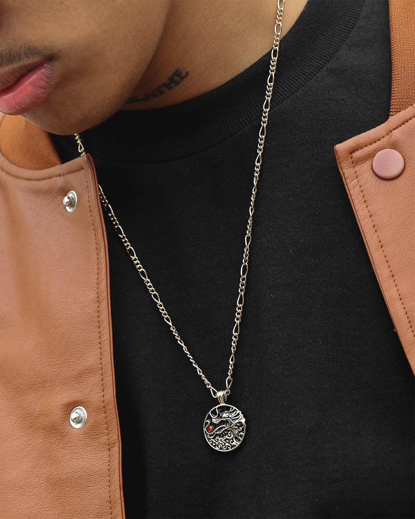 Cop the Serpentine Dragon Necklace to ice your 'fits. The round pendant features an engraved dragon face and is embellished with a glass crystal. The Figaro link chain and Wild for the Weekend engraving only add to the look.