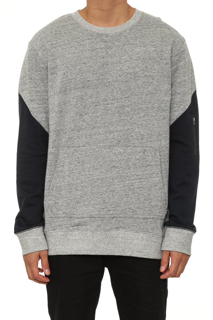 The Zanerobe XO Crew Sweat in Grey Marle/Navy is a french terry pull over sweater featuring front pouch pockets and contrast sleeve panels with zip pockets. To complete the look pair it with your favourite pair of joggers or jeans.